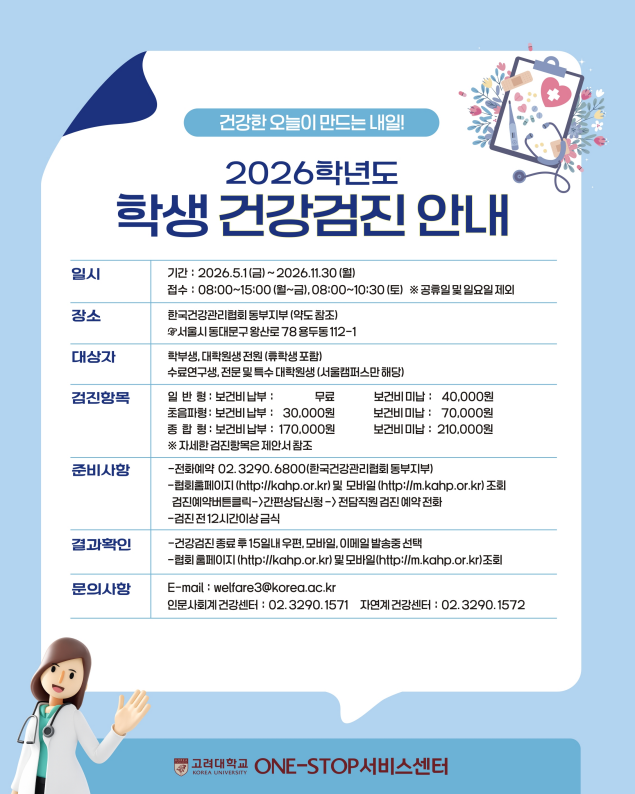 • 간호대학(학부) : 02-3290-4902    일반대학원 : 02-3290-4902    임상간호대학원 : 02-3290-4901
