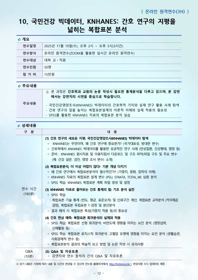 | 제목 | 국민건강 빅데이터, KNHANES: 간호 연구의 지평을 넓히는 복합표본 분석(11.19 오후) 온라인 원격연수 과정 참가신청 안내 |