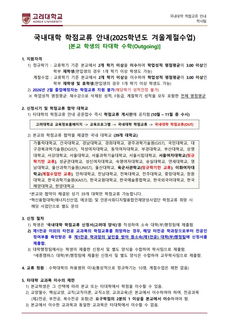 제목 2025학년도 겨울계절수업 국내대학 학점교류 안내(OUTGOING)