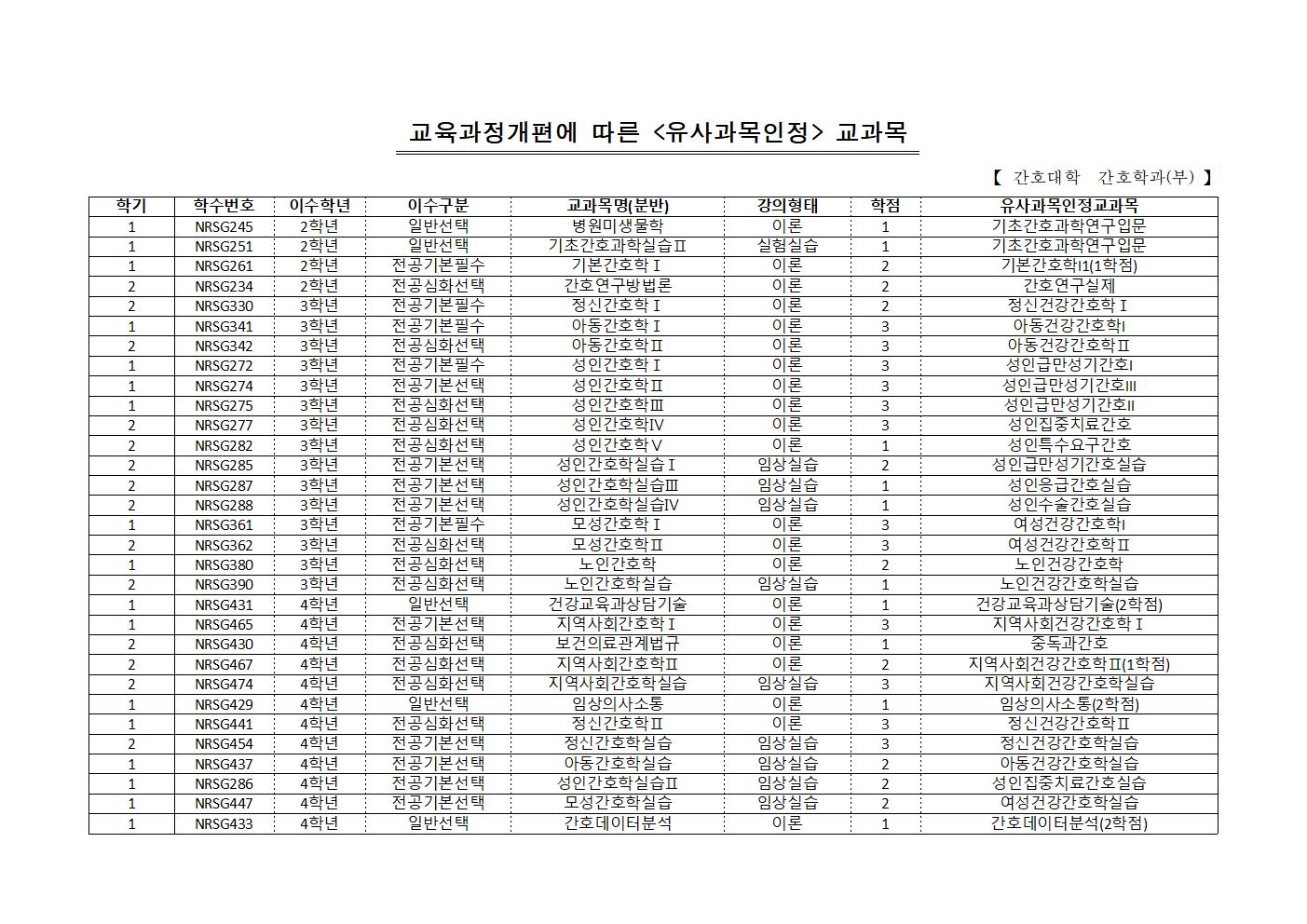 안녕하세요 간호대학 행정팀입니다. 2025학년도를 기점으로 간호대학의 교육과정이 대폭 변경되었습니다. 이에 그 전 학년도에 입학하여 본인의 교육과정과 지금의 교과목이 다른 경우가 발생합니다. 그럴 경우 첨부파일 및 아래의 유사과목인정표를 확인하시어 수강신청에 활용하시기 바랍니다. 이상입니다. 감사합니다.